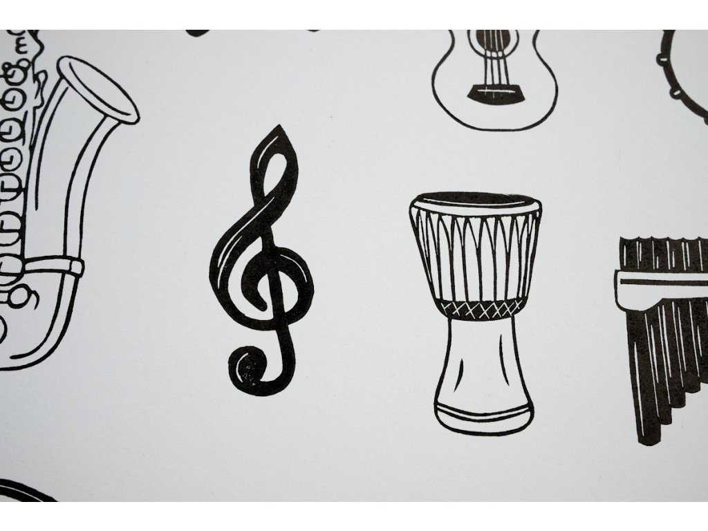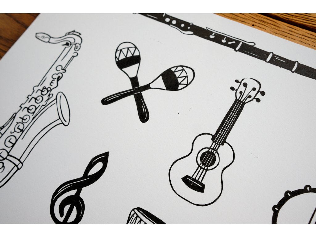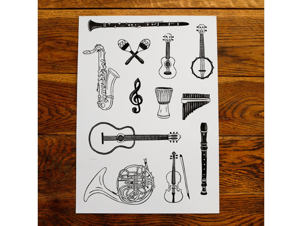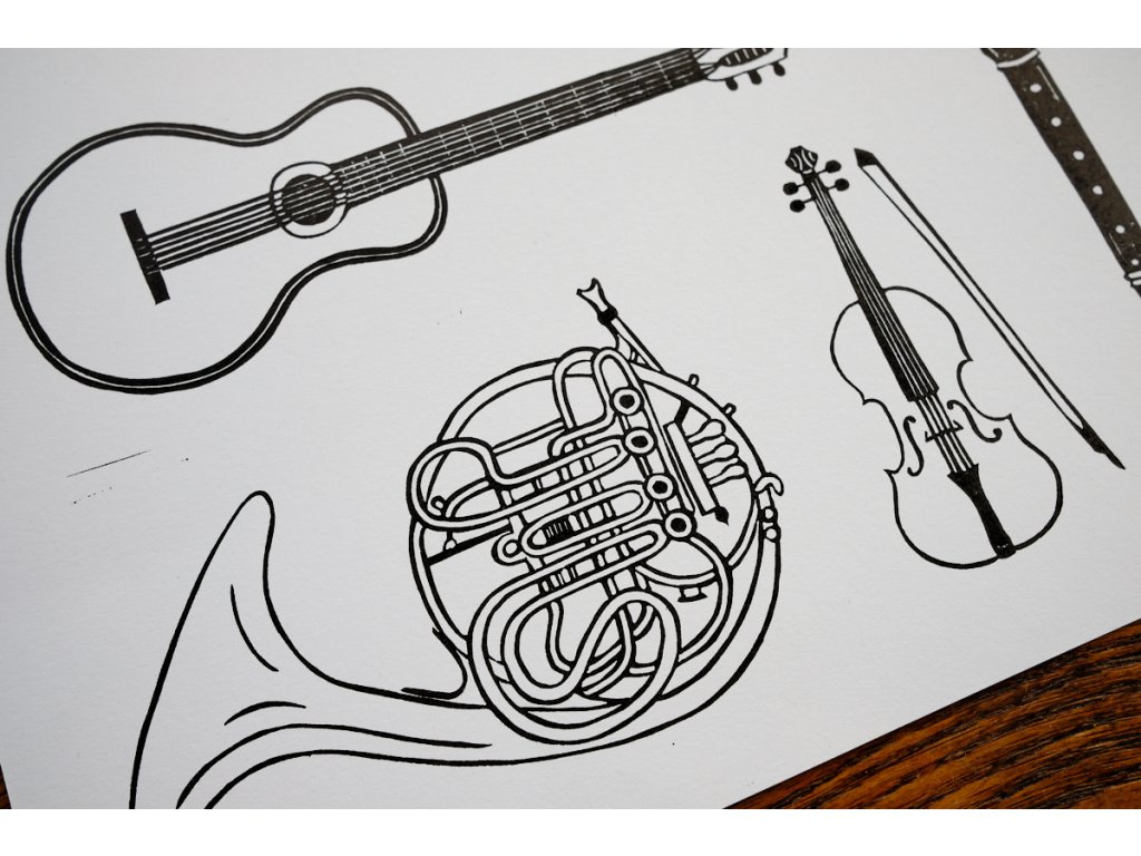Linoryt s výběrem hudebních nástrojů.