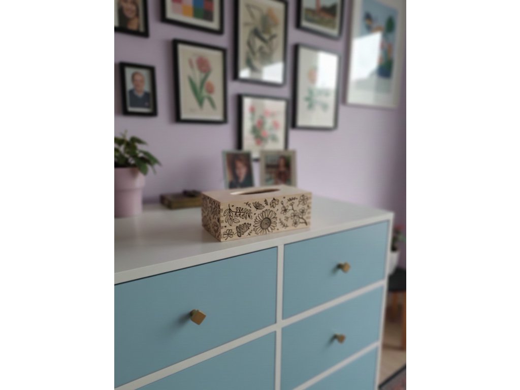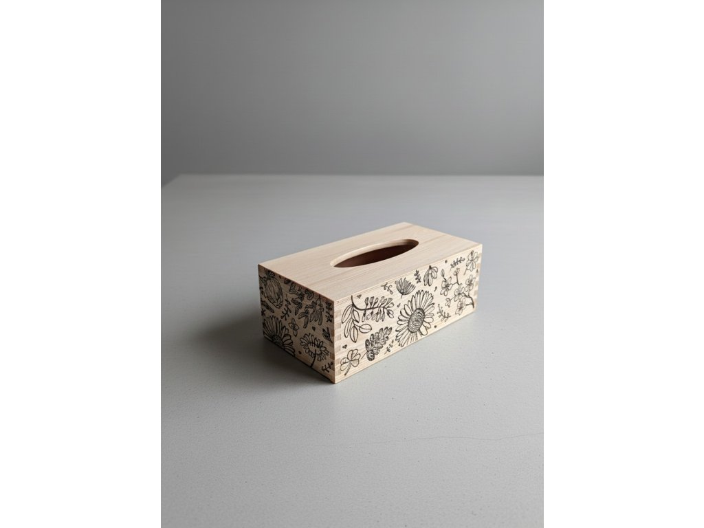 Krabička na kapesníčky je vyrobena z borovicového dřeva a vrchní a spodní díl je z překližky. Dno je vysouvací.